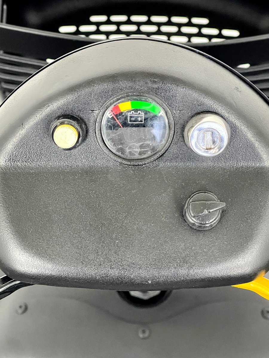 The machine is fitted with solid chunky tyres and battery pack slits making it easier to lift.